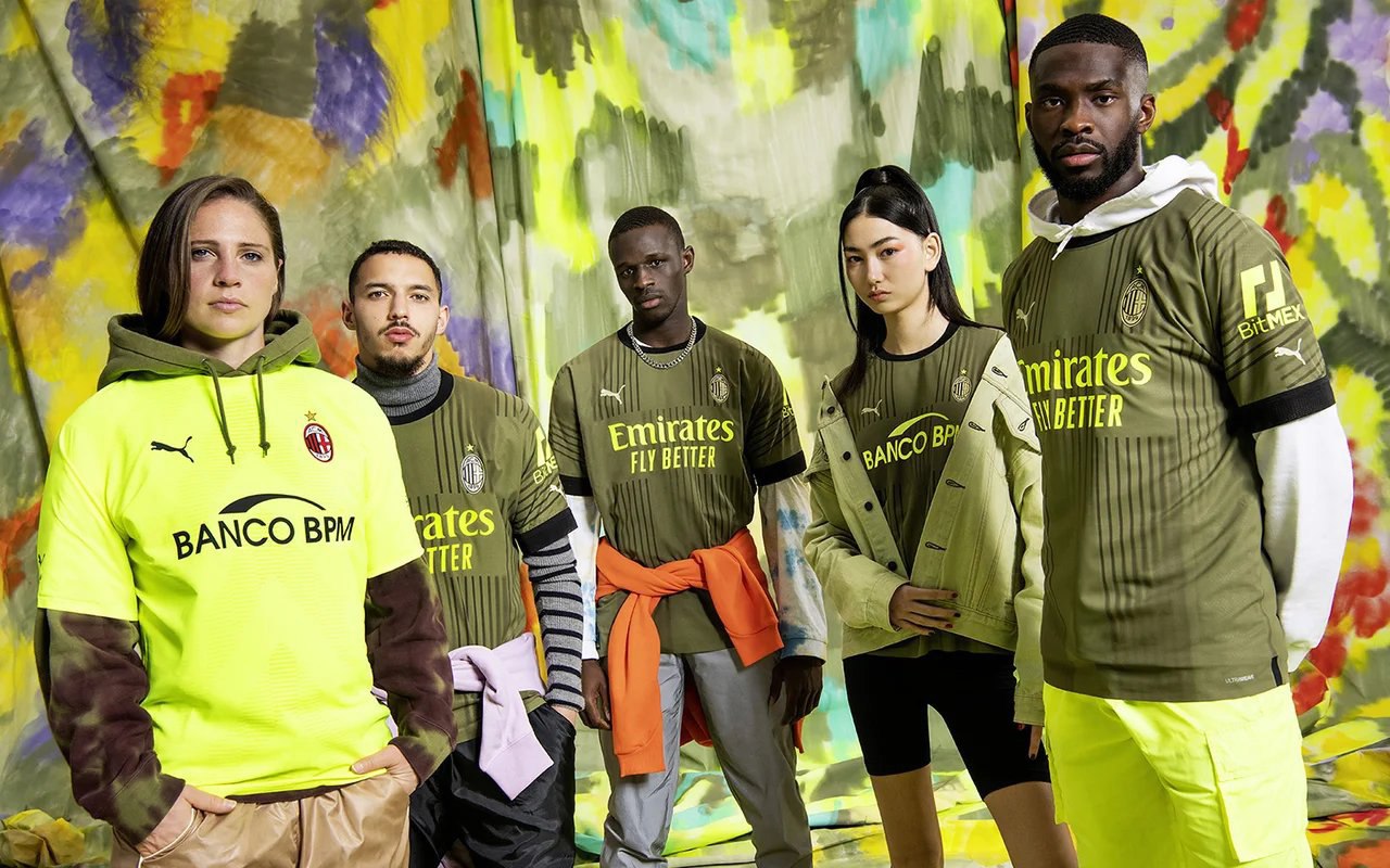The third shirt of the Rossoneri was olive green and is characterized by drawings consistent with the Milan flag, while the inscriptions appeared on the back and sleeves of the design in yellow.